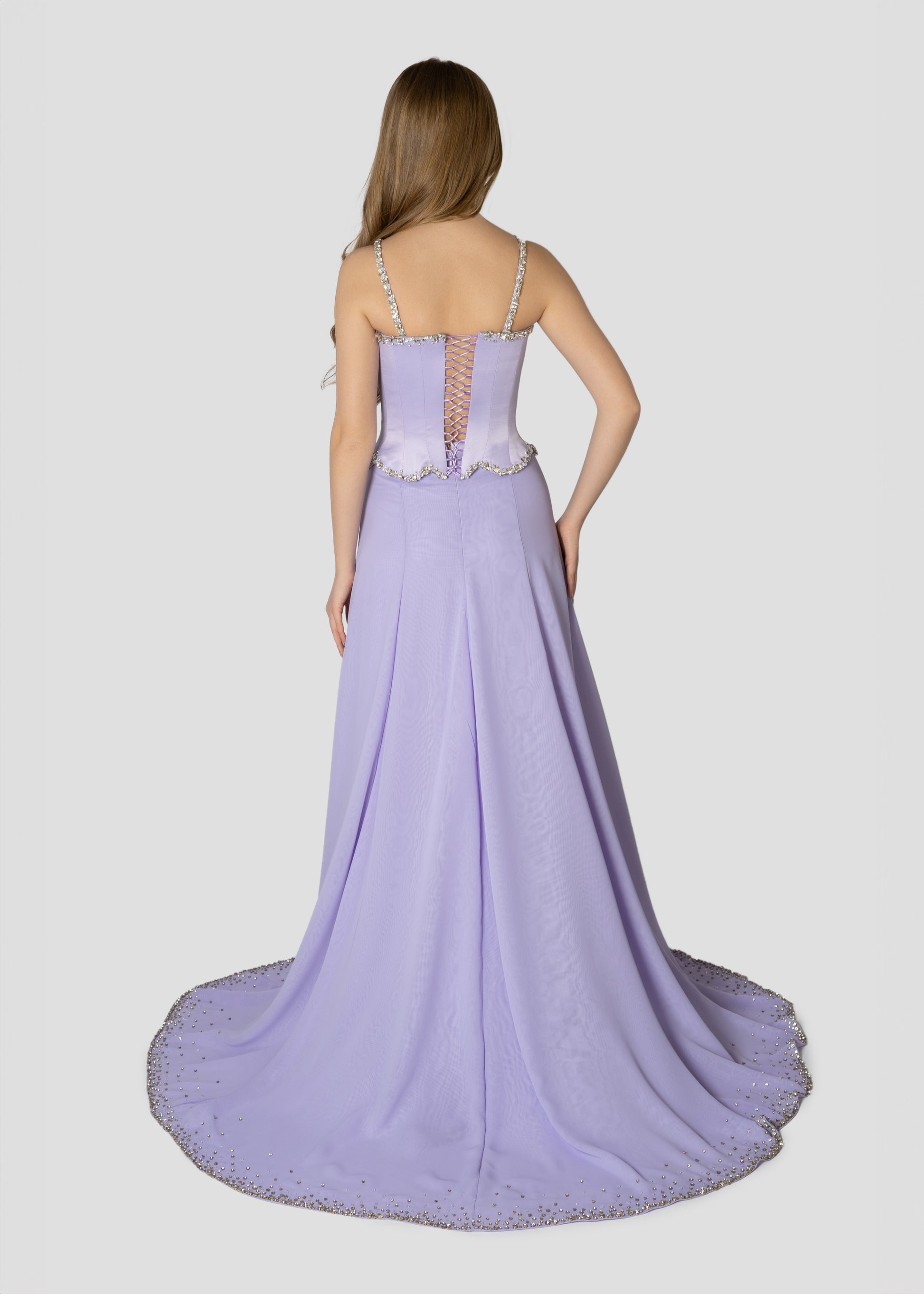 - Chiffon fabric skirt with rhinestones and crystals on the hemline