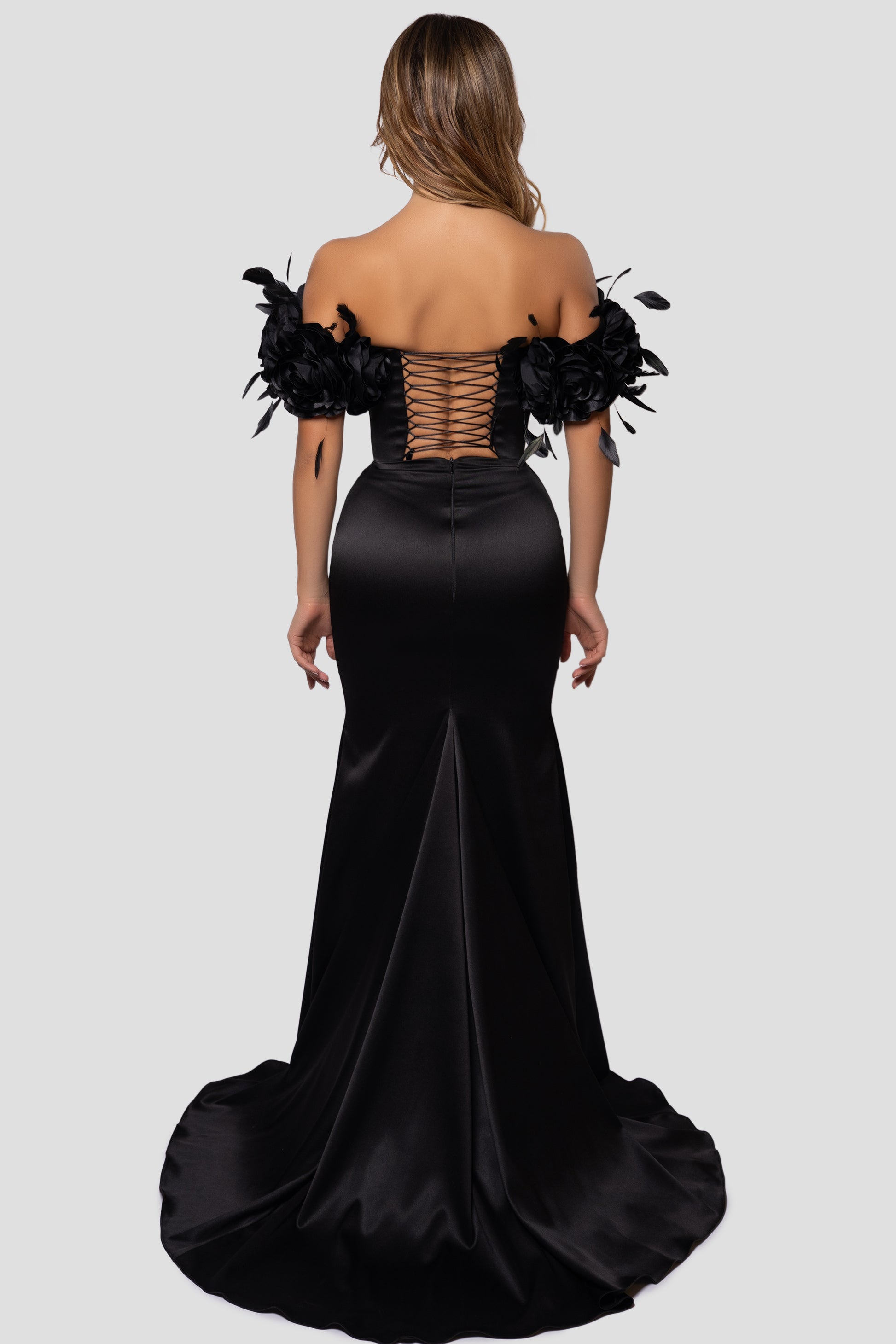 SILK BLACK DRESS WITH HANDMADE FLOWERS